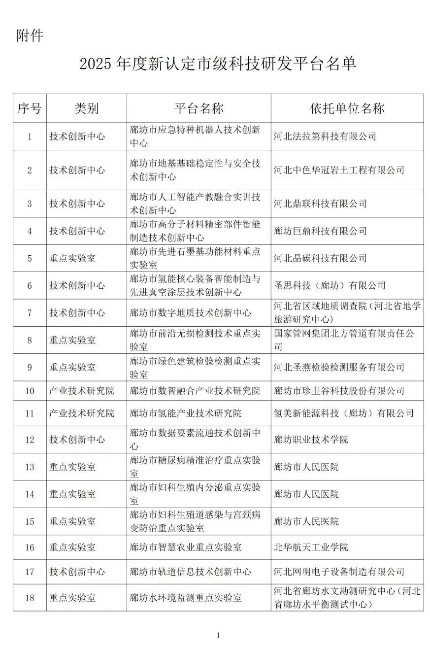 廊坊市科学技术局 关于公布2025年度新认定市级科技研发平台名单的通知各县(市、区)、廊坊开发区、临空经济区(廊坊)科技管理部门,各有