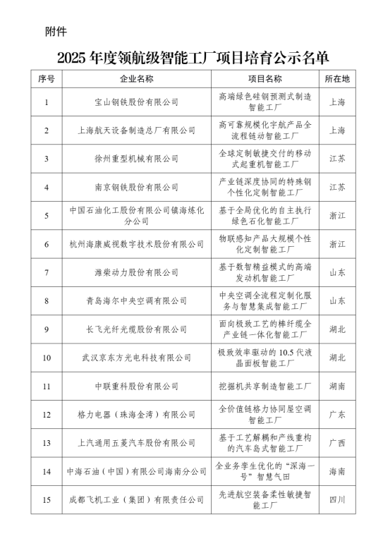 关于2025年度领航级智能工厂项目培育名单的公示根据《关于开展2025年度智能工厂梯度培育行动的通知》(工信厅联通装函〔2025〕251号),现