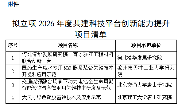 关于拟立项2026年度共建科技平台创新能力提升项目的公示各有关单位: 根据《河北省创新能力提升计划项目管理办法》等有关规定,现对拟立
