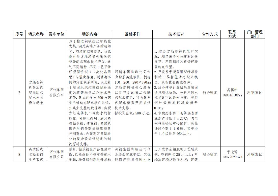 为加速释放创新应用场景驱动效应,助推我省钢铁产业高质量发展,按照《打造和开放创新应用场景工作指引》(冀科成市函〔2023〕45号),省科技厅会同省直有关部门征集、设计和遴选出23项创新应用场景,现予以发布。请各归口管理部门积极组织对接活动和服务,推动创新应用场景尽快落地实施,并跟进场景发布单位定期填报工作进展情况。